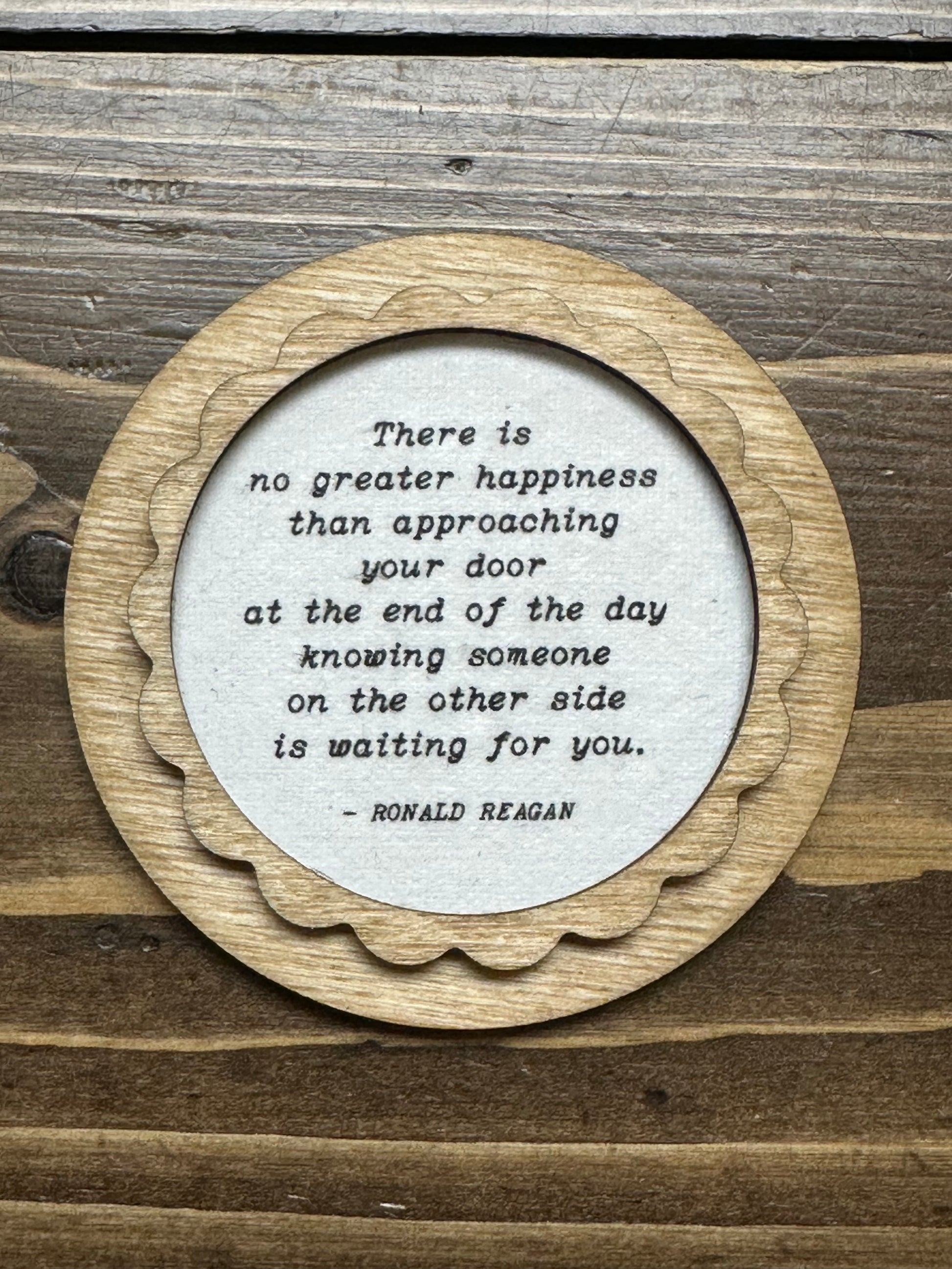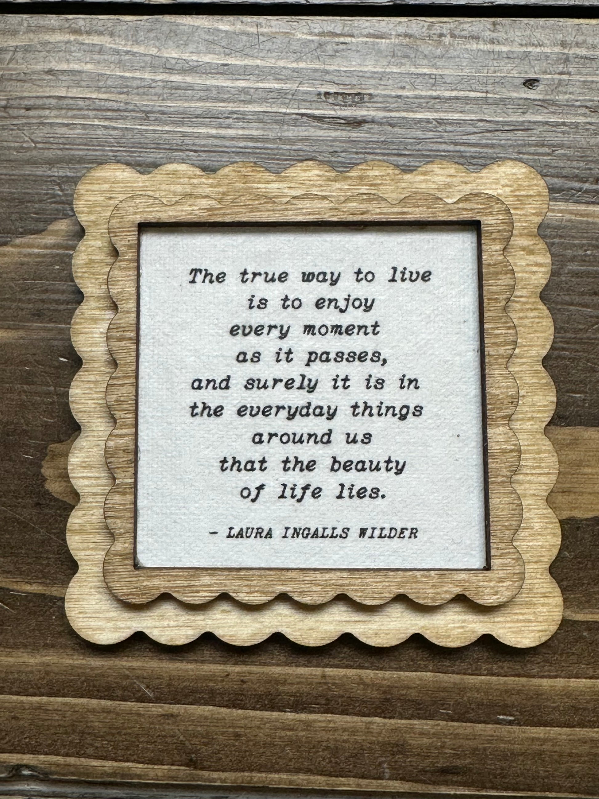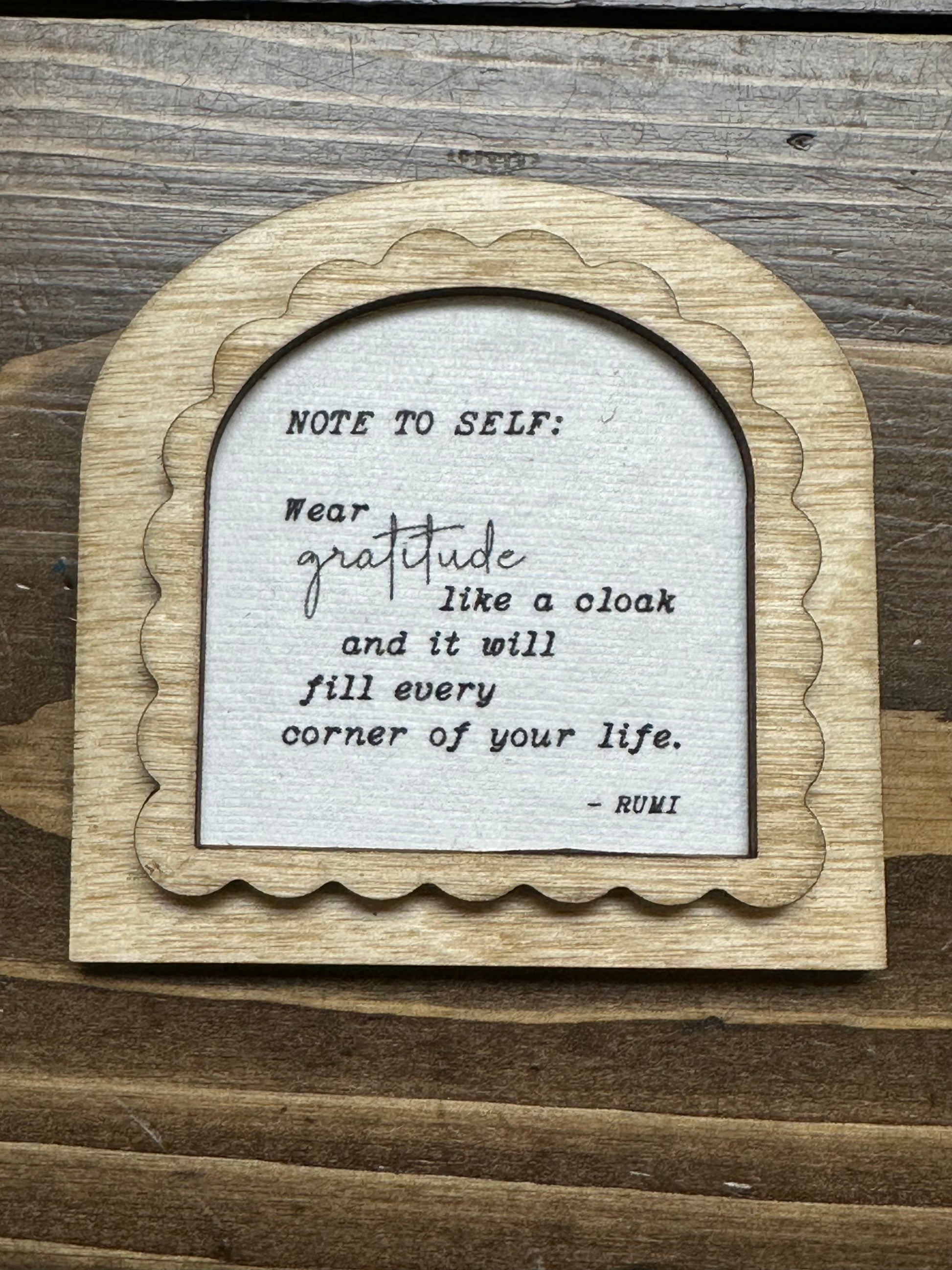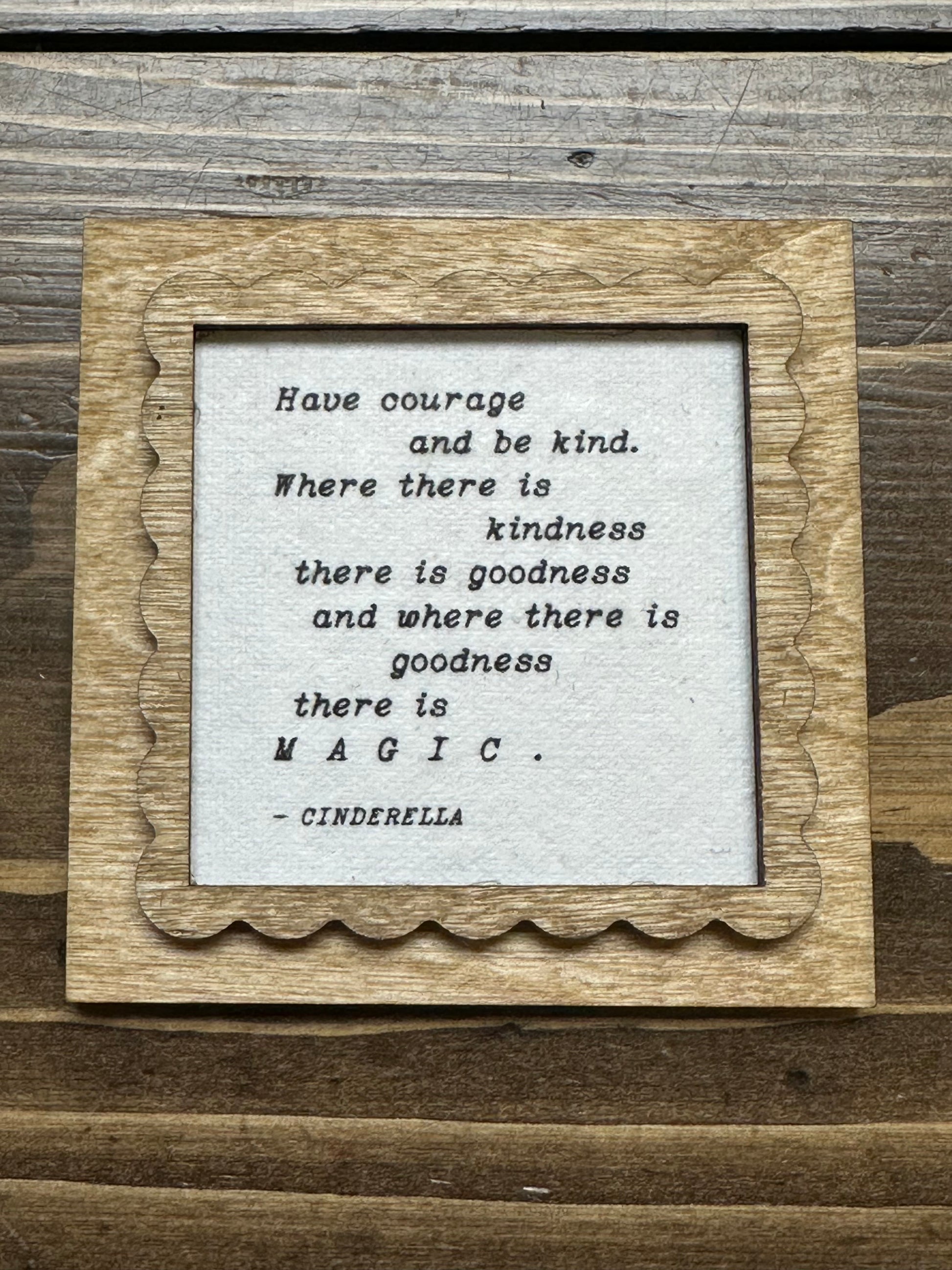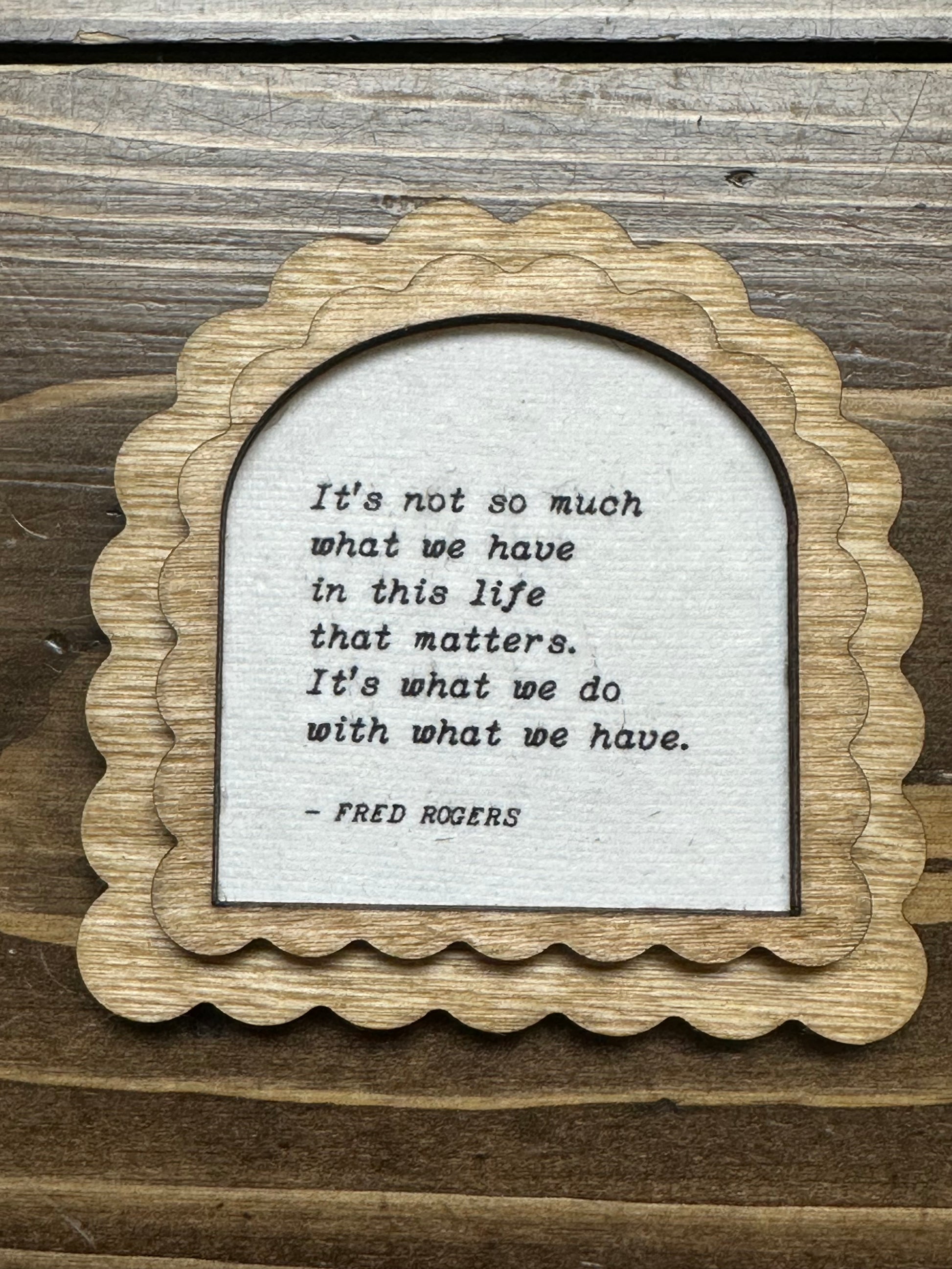 12 different inspirational quotes in a handmade scallop framed magnet.