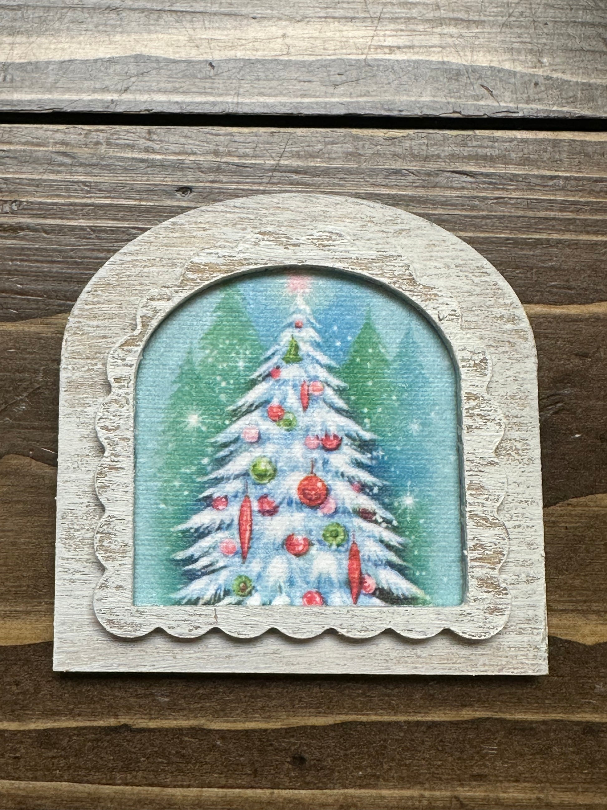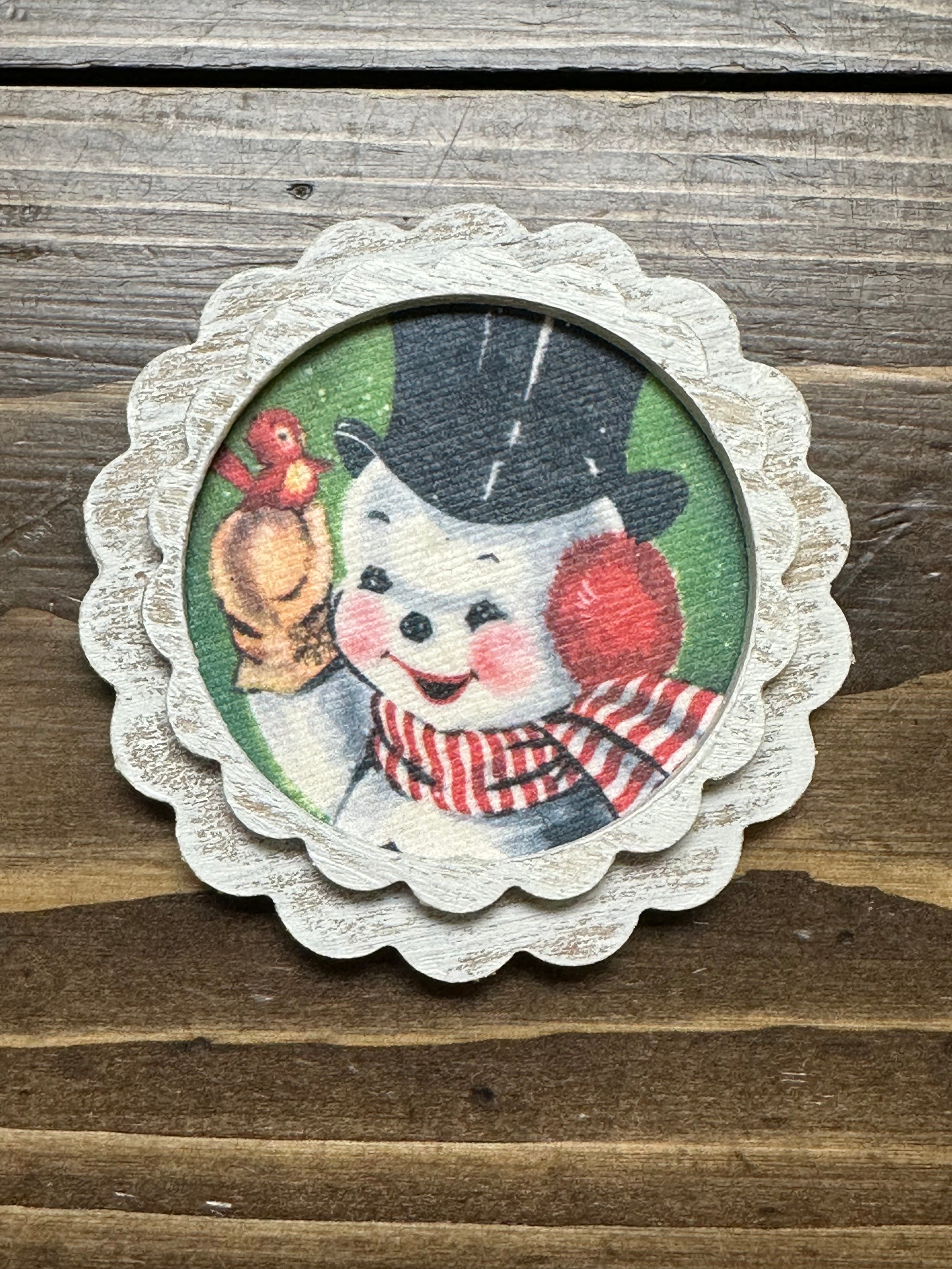 Vintage retro Christmas tree, Santa, Rudolph, snowman, candy can and ornaments prints make unique and fun vintage style scallop holiday framed magnets!