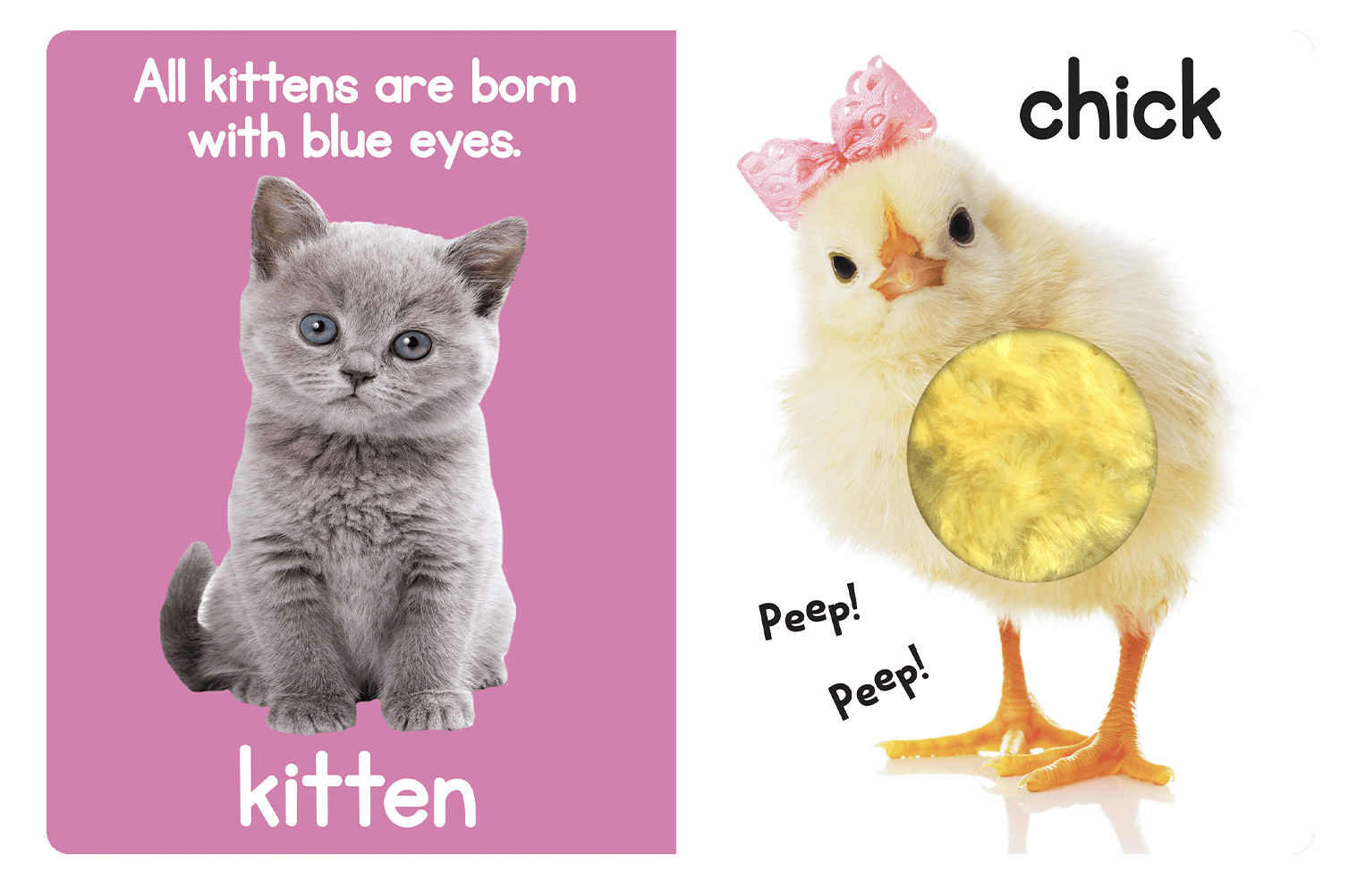 Real photography of adorable animals, such as a lion cub, lamb, panda and more are in this toddler book with short sentences and fun animal facts will keep baby's attention.
