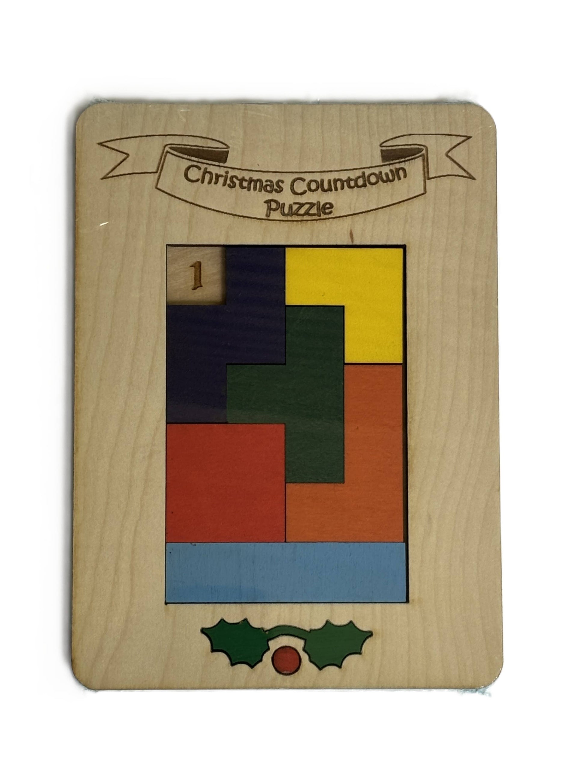 The 24 days from Dec 1 to 24 are engraved into the bottom of the tray. Your goal is to fit the six included pieces into the tray. There will always be one space left over which is intended to show the coinciding day when solved.