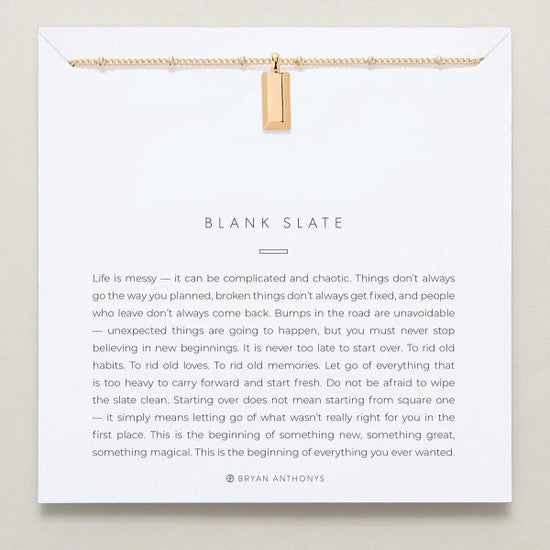 The Blank Slate Dog tag Necklace is presented on a card with the following description, "Life is messy - it can be complicated and chaotic. Things don't always go the way you planned, broken things don't always get fixed, and people who leave don't always come back. Bumps in the road are unavoidable - unexpected things are going to happen, but you must never stop believing in new beginnings. It is never too late to start over. To rid old habits. To rid old loves. To rid old memories. Let go of everything that is too heavy to carry forward and start fresh. Do not be afraid to wipe the slate clean. Starting over does not mean starting from square one - it simply means letting go of what wasn't really right for you in the first place. This is the beginning of something new, something great, something magical. This is the beginning of everything you ever wanted.