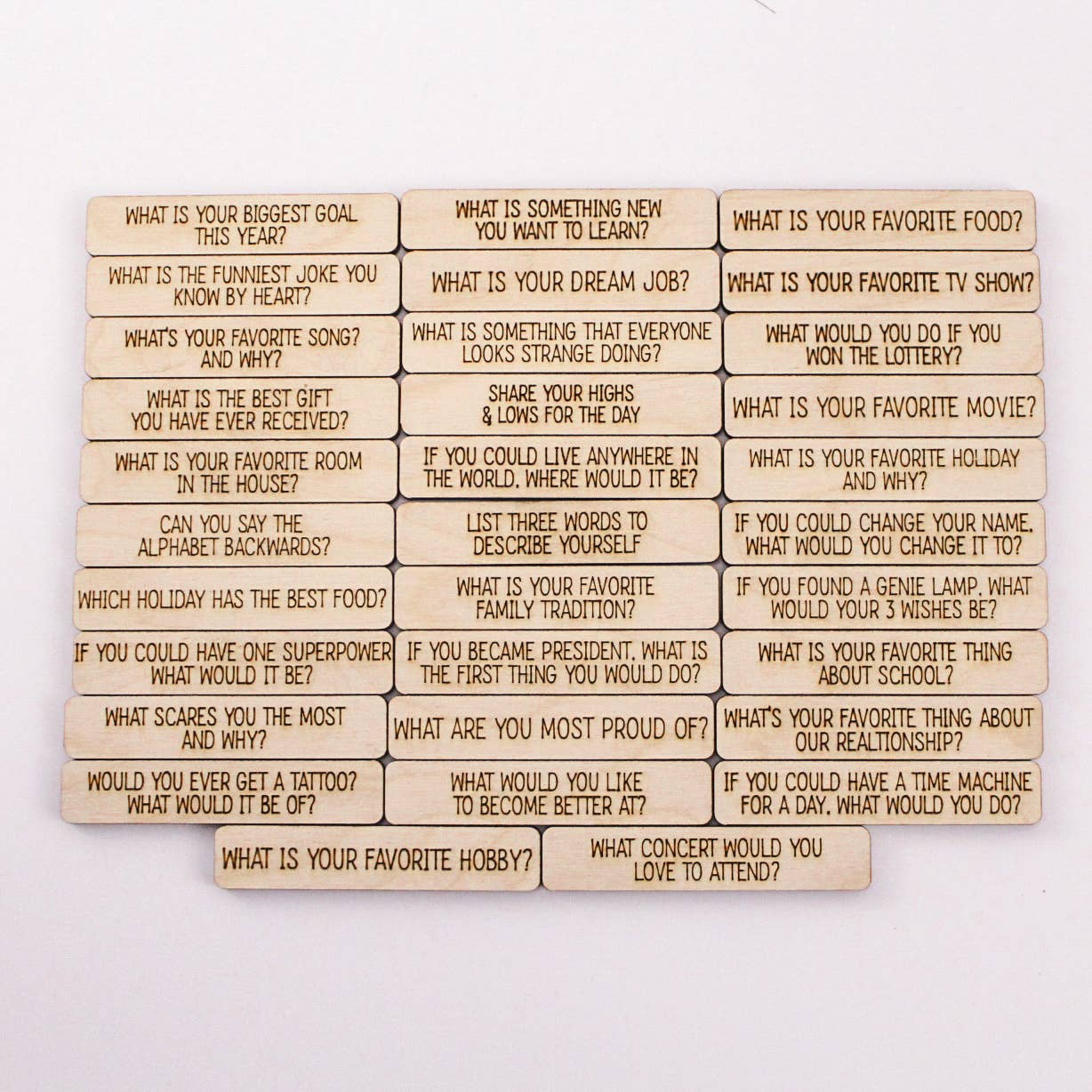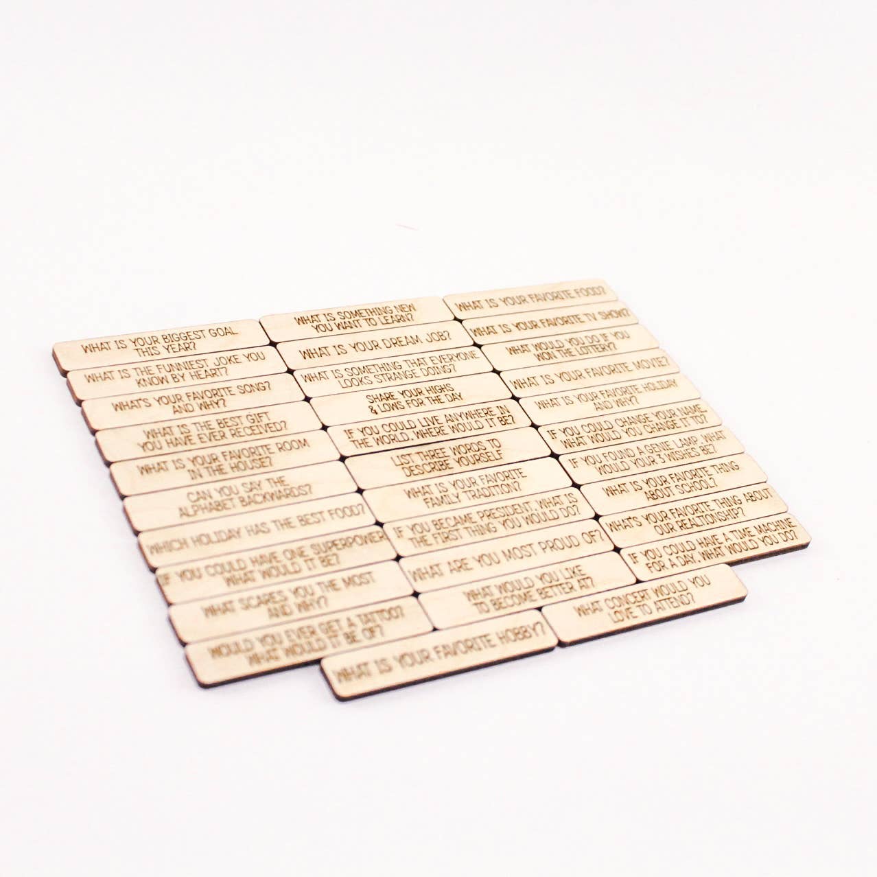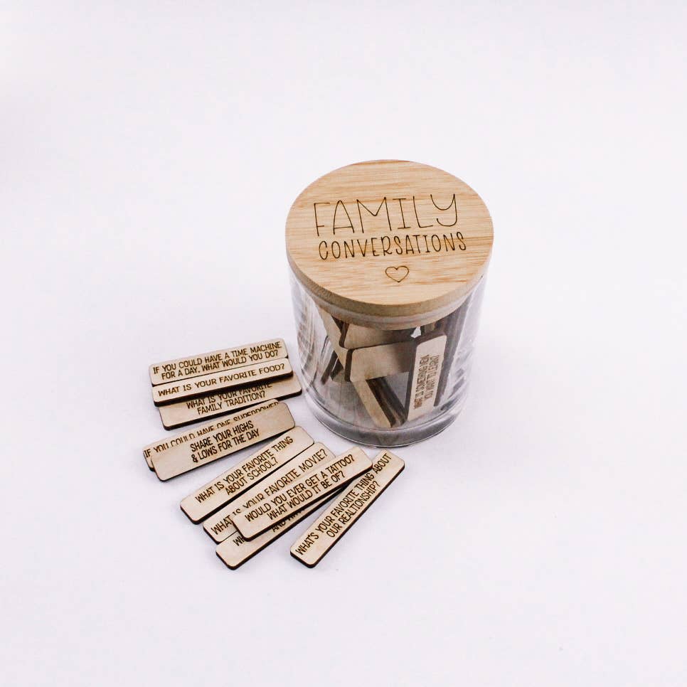 This glass jar with a Bamboo Lid is engraved with the words "Family Conversations" and comes with 32 conversation starters laser engraved onto wooden tiles.