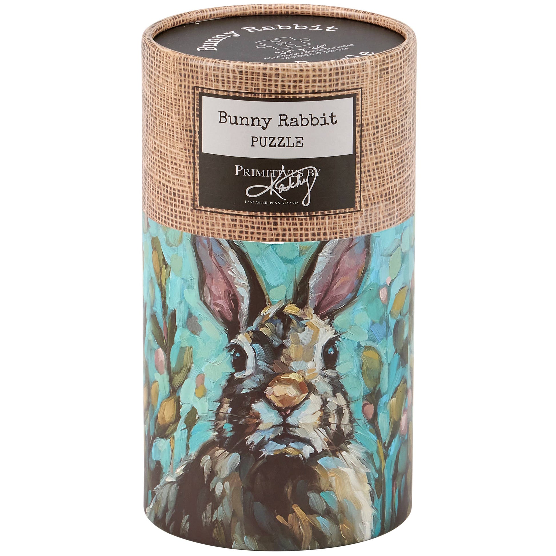 Design is replicated from original artwork hand painted in a unique textured style. Puzzle pieces are packaged in a resealable plastic bag and enclosed in a cylindrical box with the full design displayed around the outside and a descriptive "Bunny Rabbit Puzzle" sentiment on lid.
