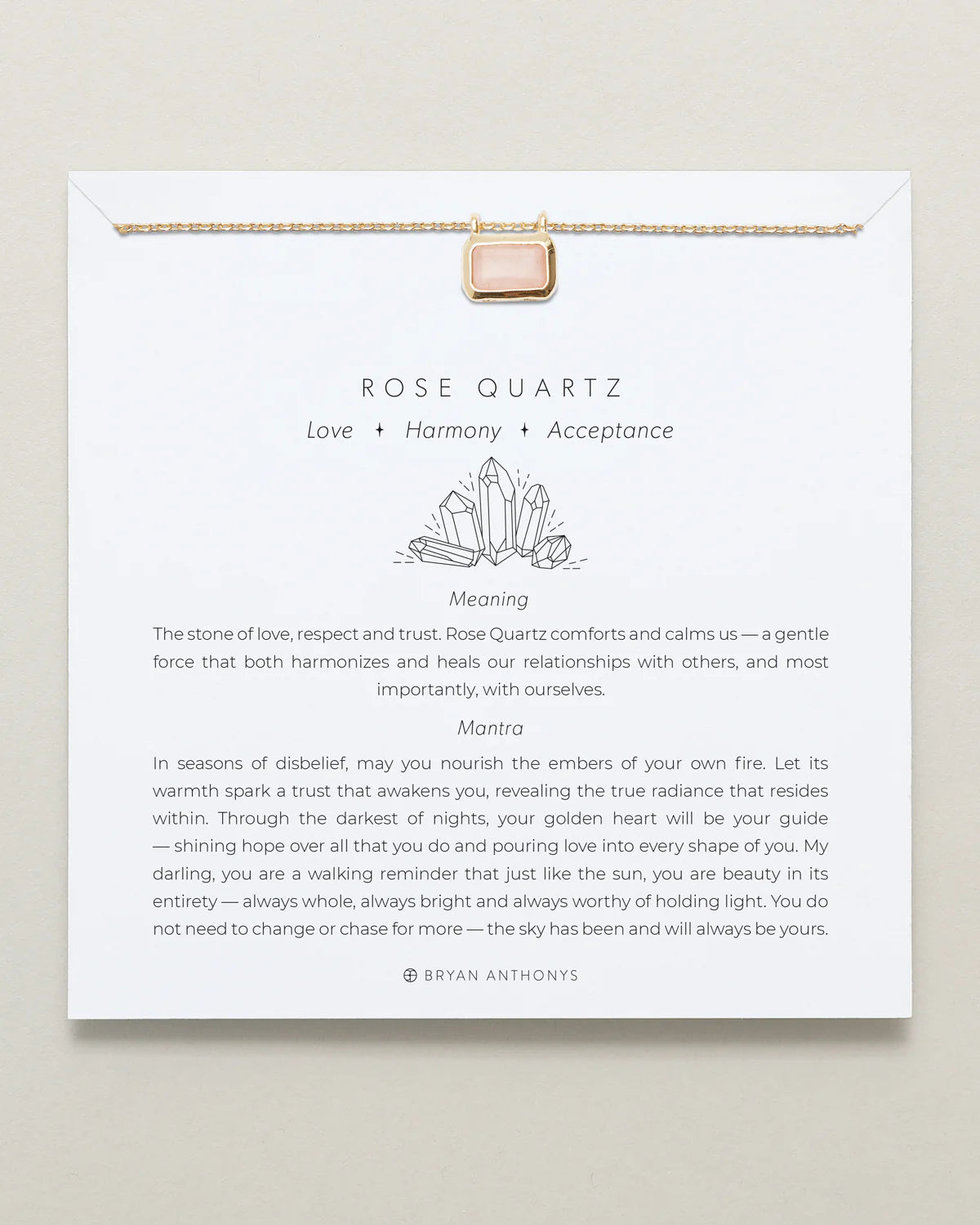 The stone of love, respect and trust. Rose Quartz comforts and calms us — a gentle force that both harmonizes and heals our relationships with others, and most importantly, with ourselves.