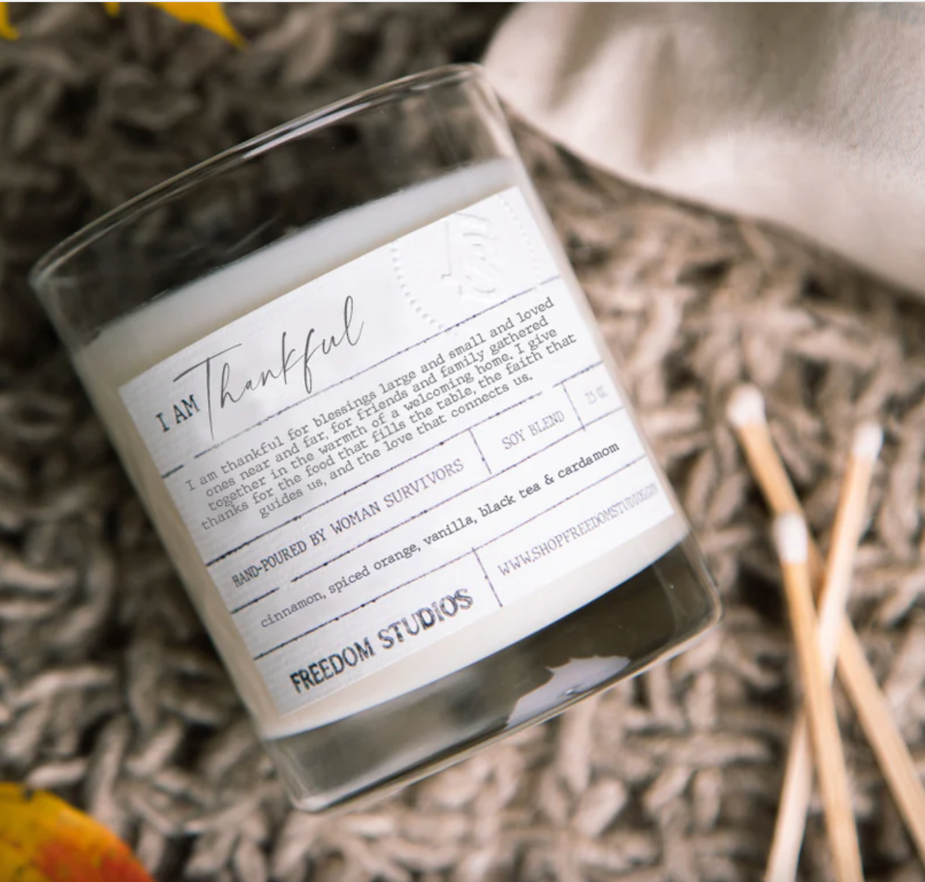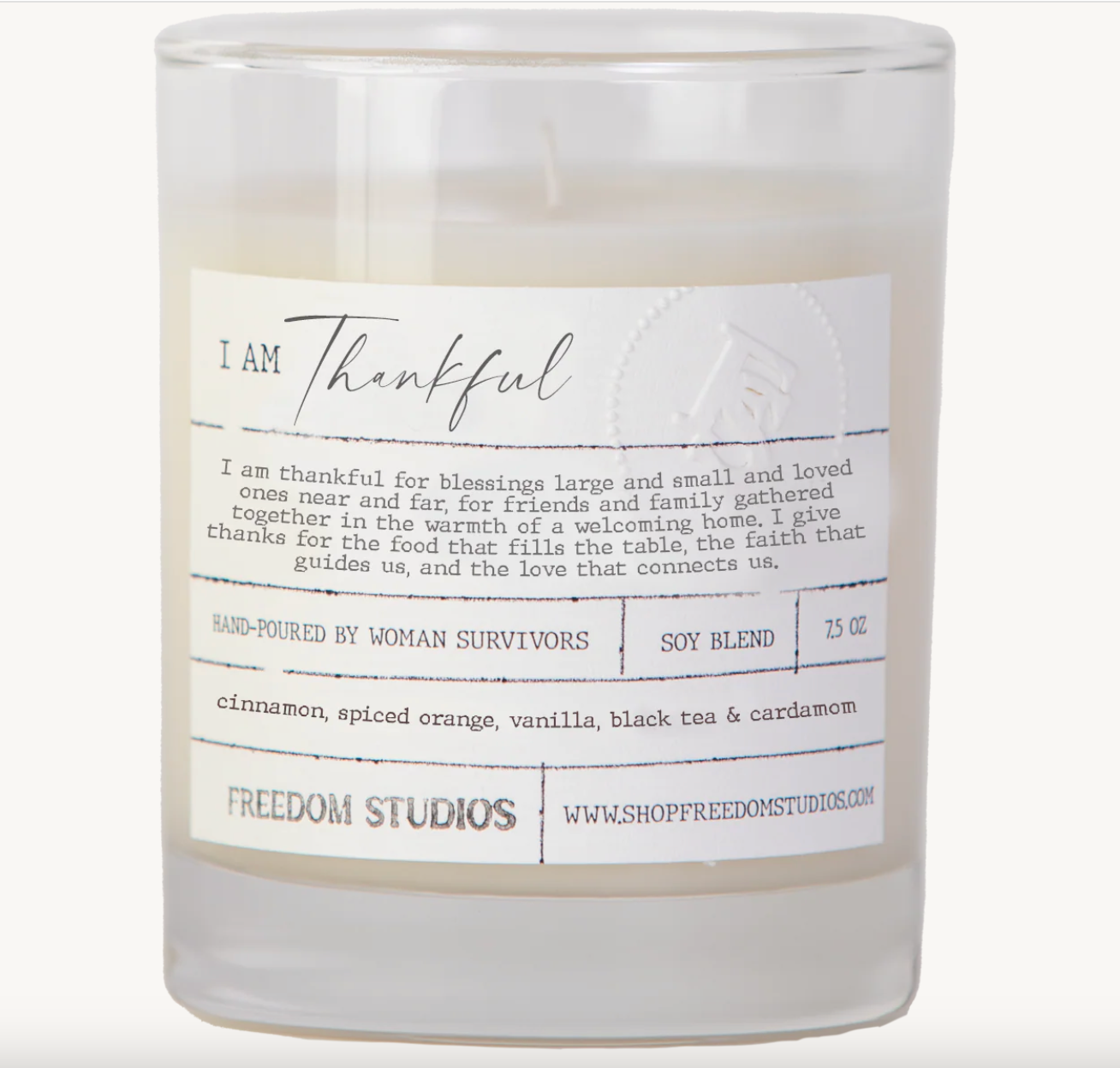 This 7.5 oz glass candle is made with soy blend wax and clean-burning cotton wicks and fragrances. Each candle is hand-poured by women survivors and comes in a cotton bag.
