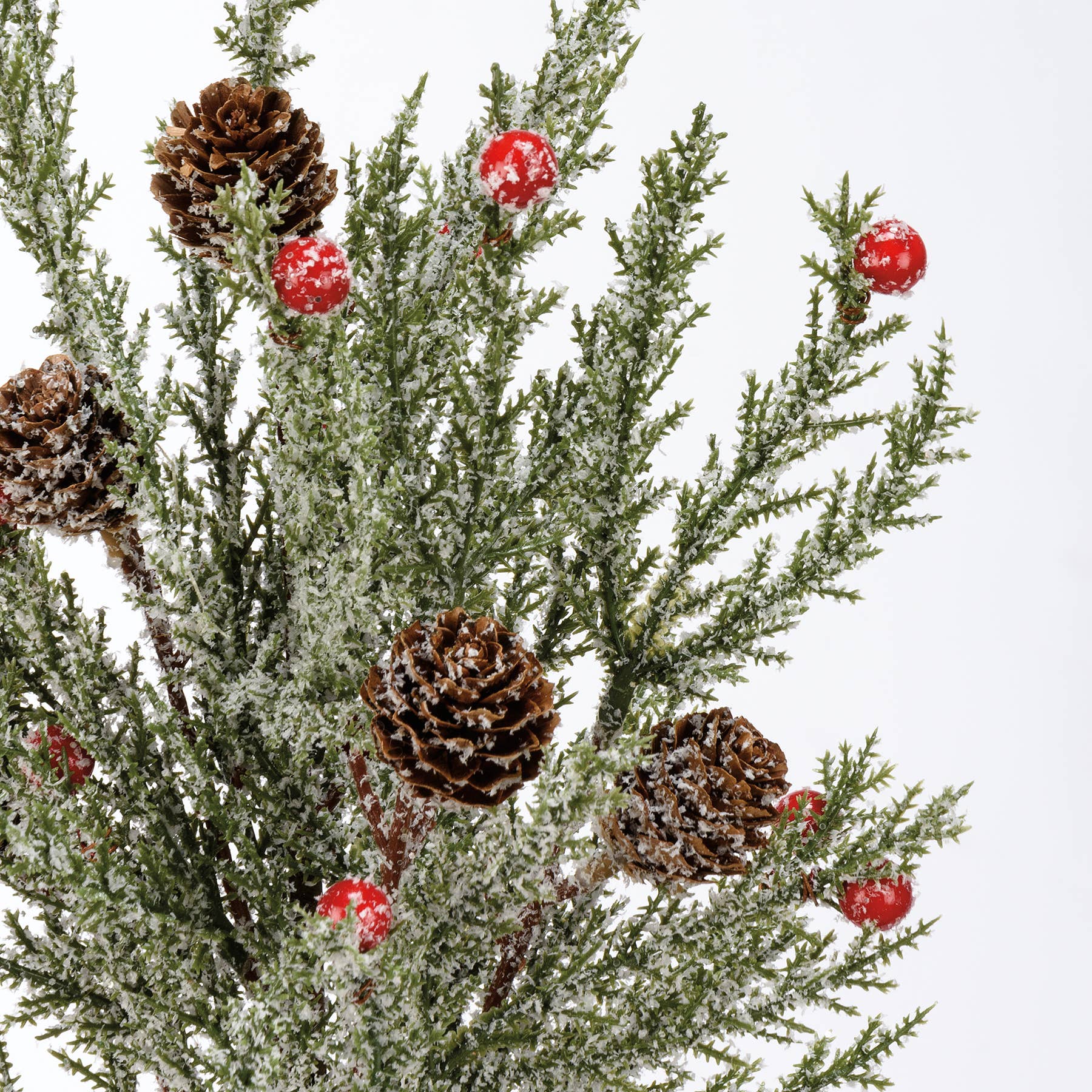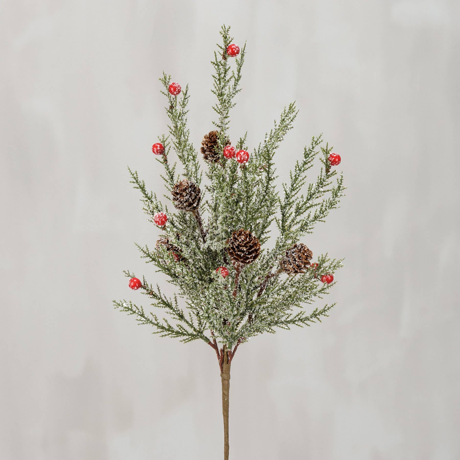 A pick featuring berries and pinecones with a mica coating for a snowy effect.