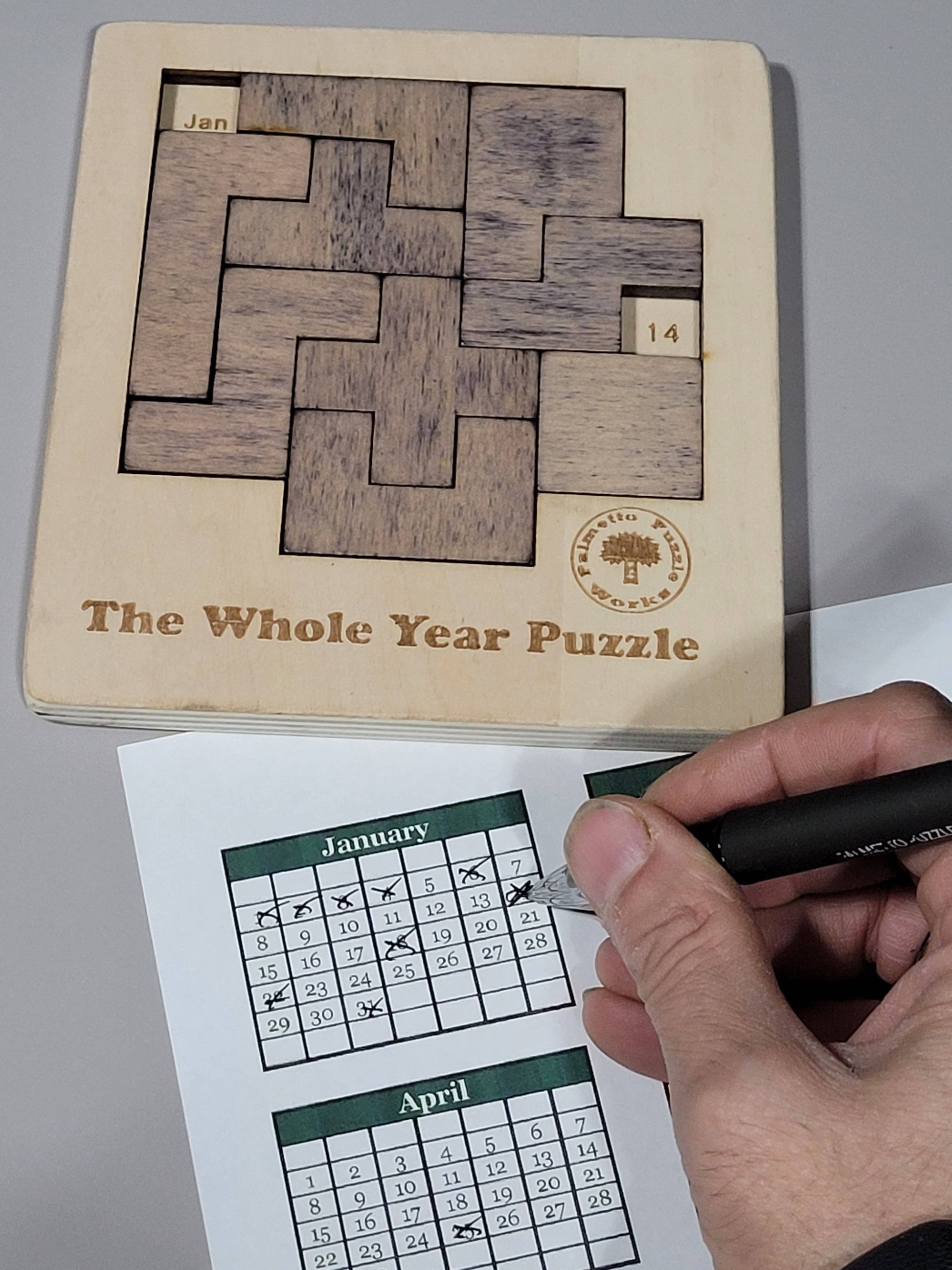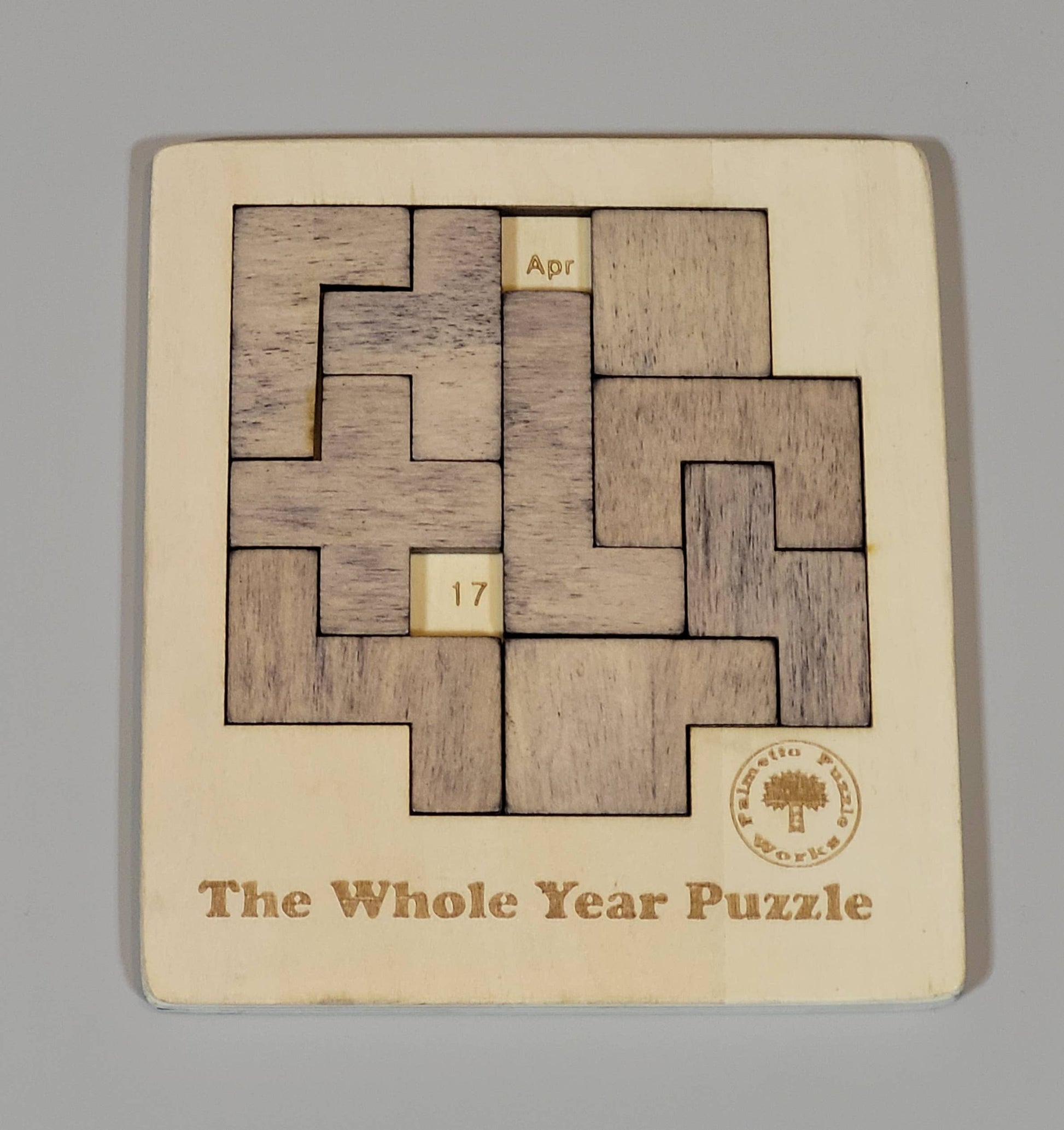 The tray of this puzzle displays a calendar for the entire year. Included are nine pieces that need to be placed inside the tray until all but two spaces are open, displaying a date.
