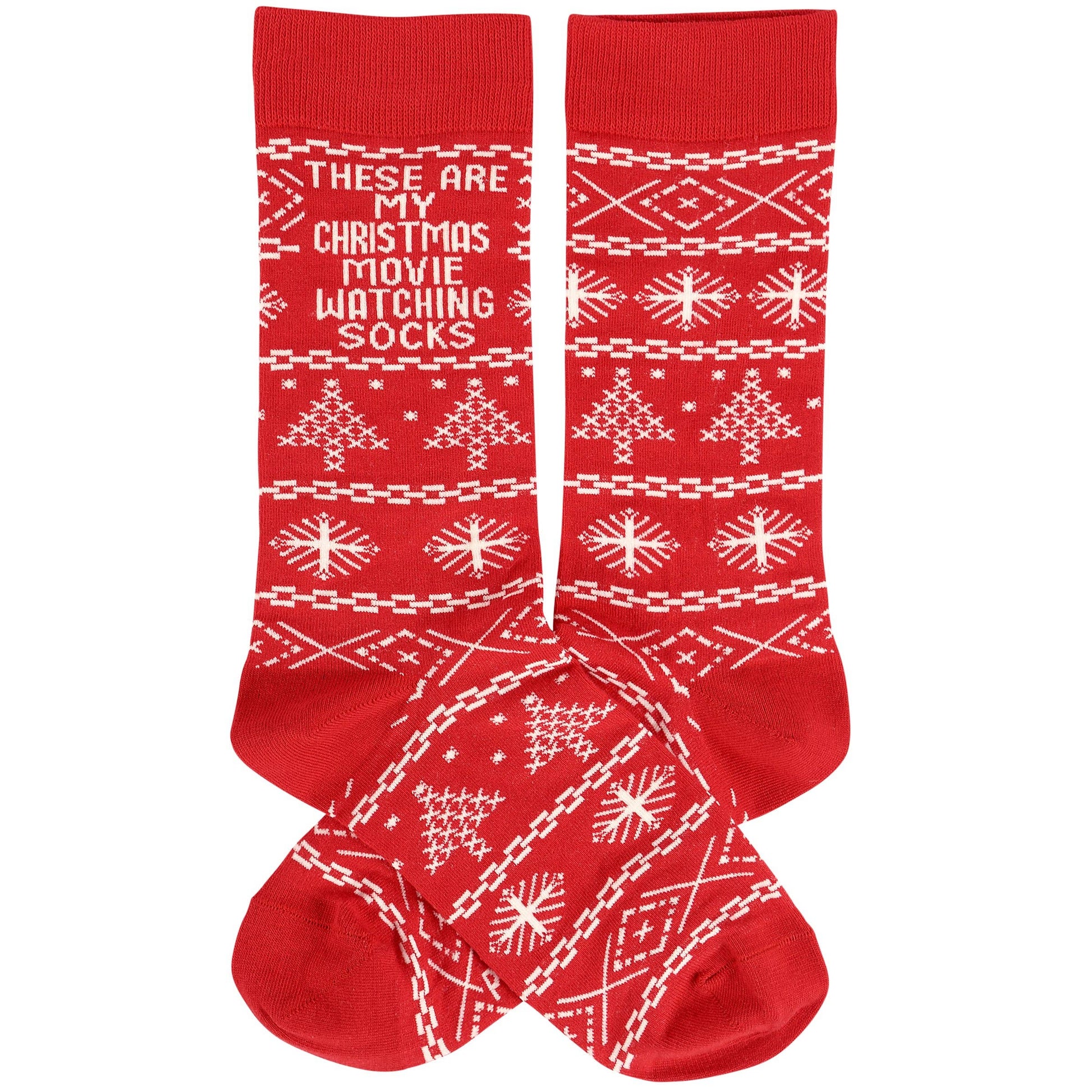 A pair of colorful socks from our Christmas Collection displaying playful hand illustrated designs of Christmas motifs in a knitted style with a humorous seasonal sentiment that reads "These Are My Christmas Movie Watching Socks."